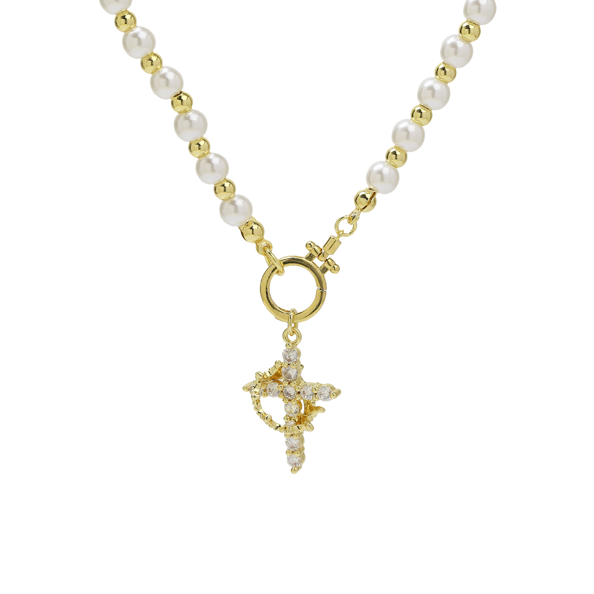Pearl Beaded Zirconia Cross Pendant Necklace